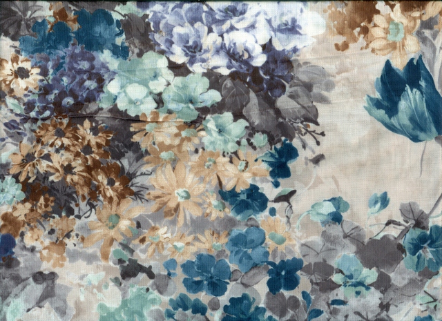 Modischer, fließender Jersey mit Blumendruck in creme-blau-türkis-beige-braun.