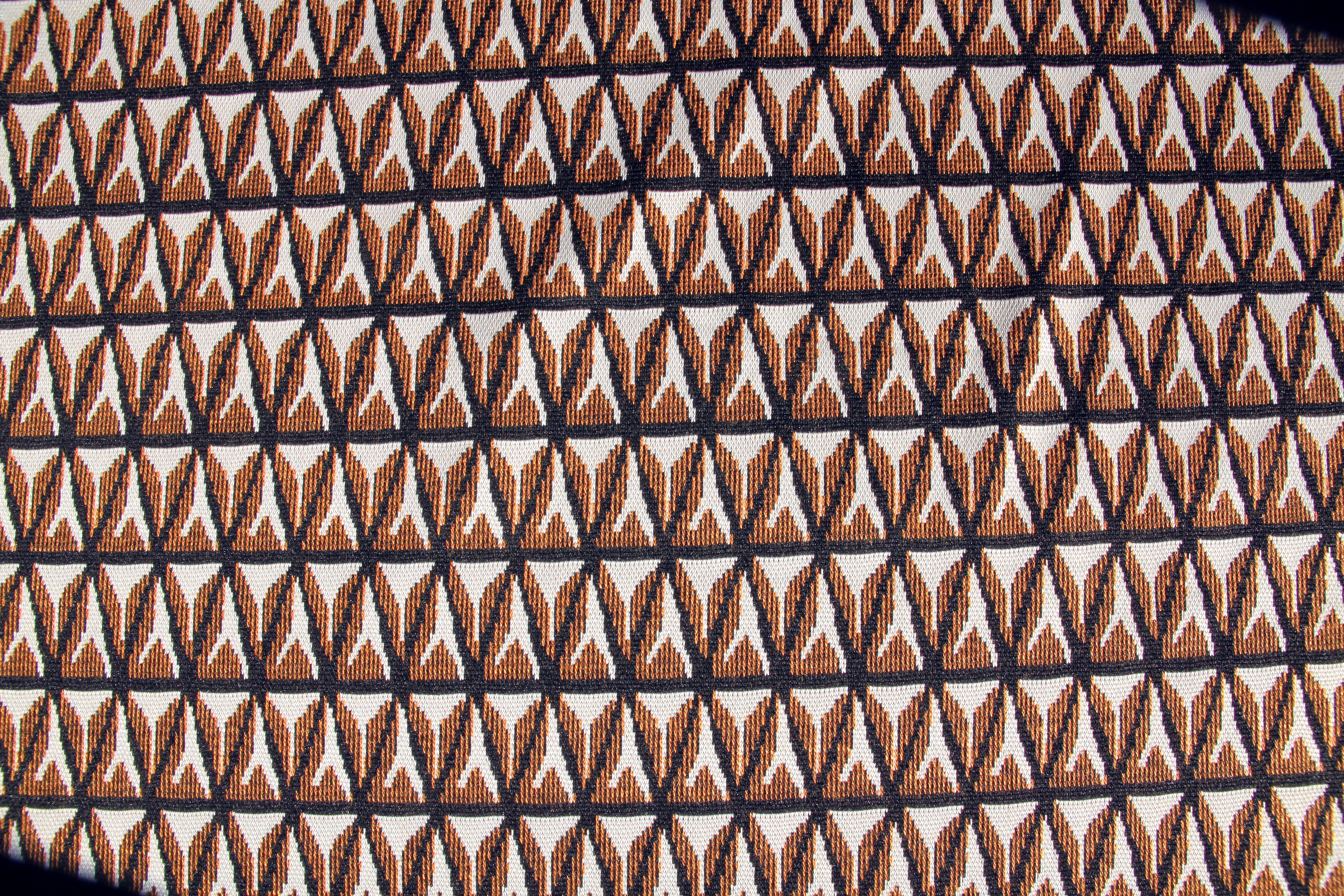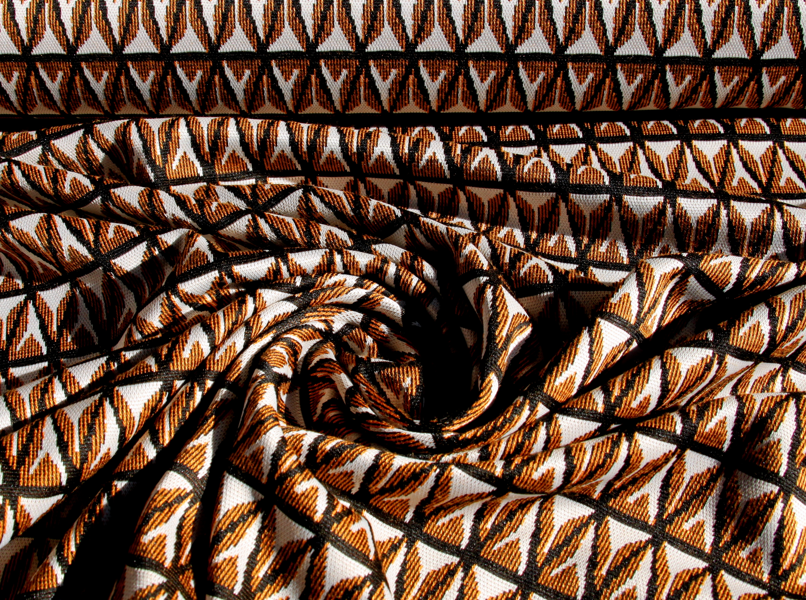 Elastischer Jersey aus Viskose-Mischgewebe mit graphischem Muster in grün-ecru oder cognac-ecru. Der schwere aber dennoch weich fallende, elastische Strickstoff eignet sich besonders für Shirts, Pullover, Tuniken, Westen, Jacken, Kleider, Röcke und Accessoires.