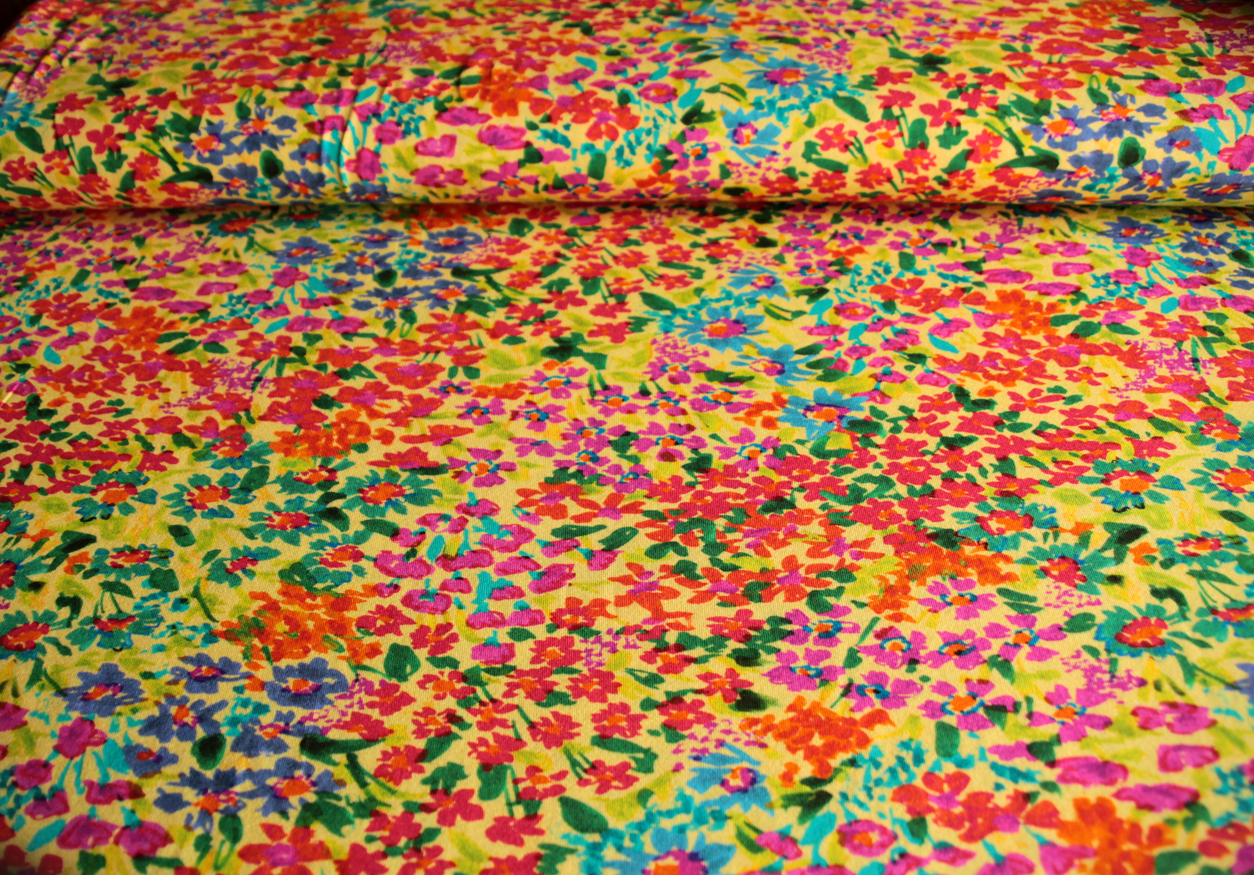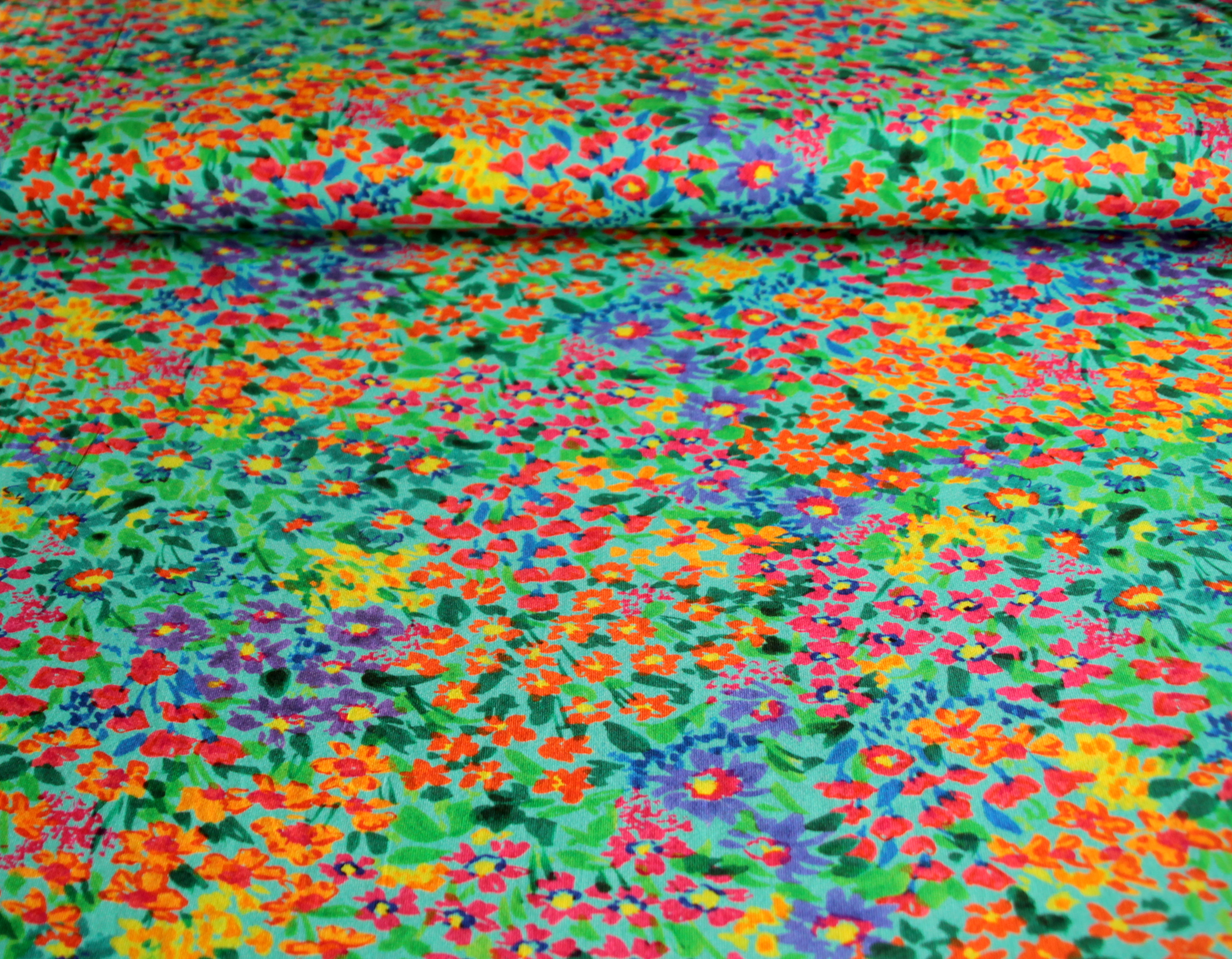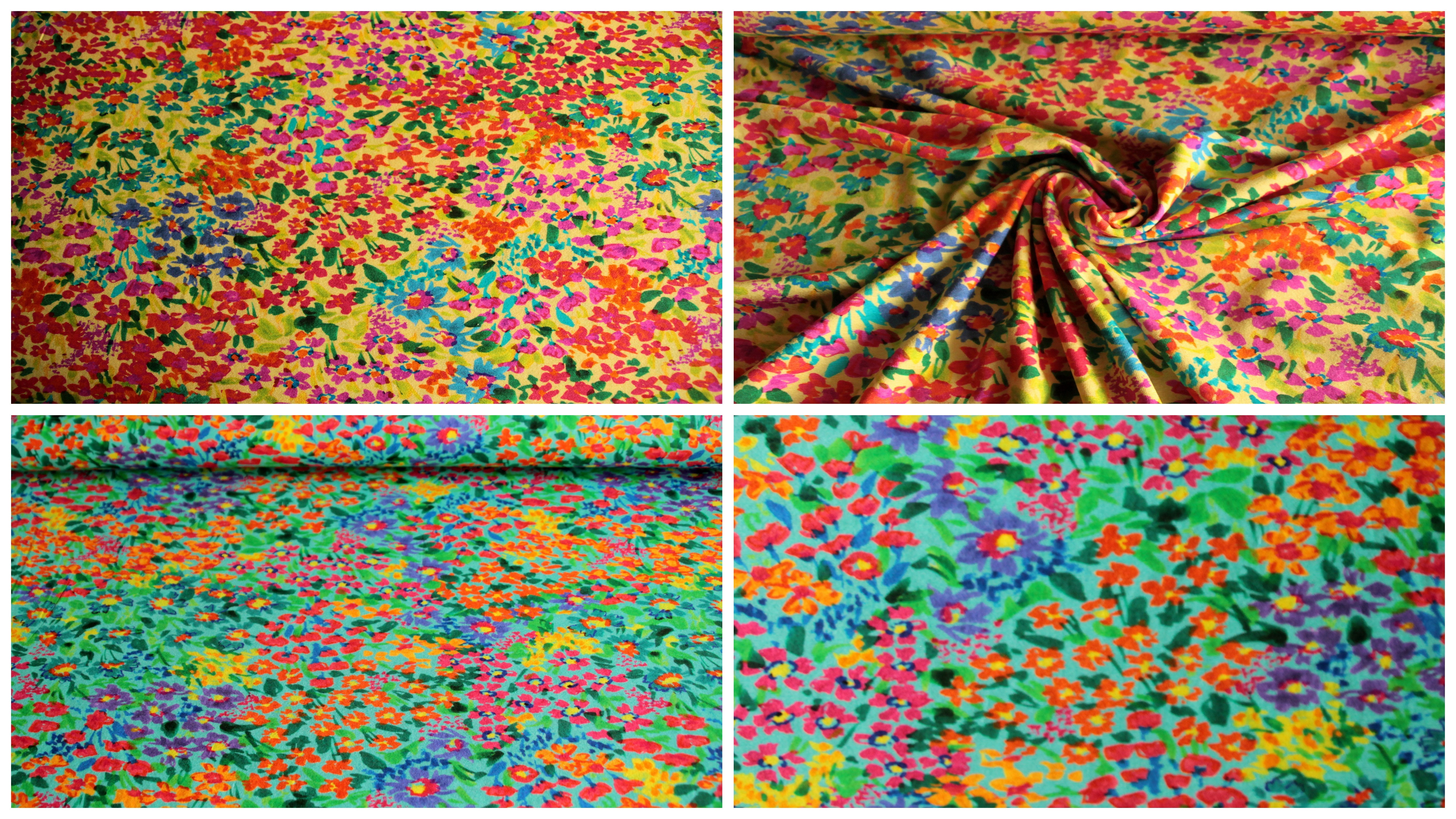 Modischer, weicher, fließender Jersey mit bunten Streublümchen auf gelbem oder mintfarbenem Grund. Der anschmiegsame, elastische Jersey mit glattem Griff hat einen schönen Fall. Der verspielte, farbstarke Blümchendruck wirkt fröhlich und sommerlich und eignet sich besonders für Sommerkleidung für Damen und Kinder wie T-Shirts, Tops, Tuniken, Kleider, Röcke,Hosen und Leggings.