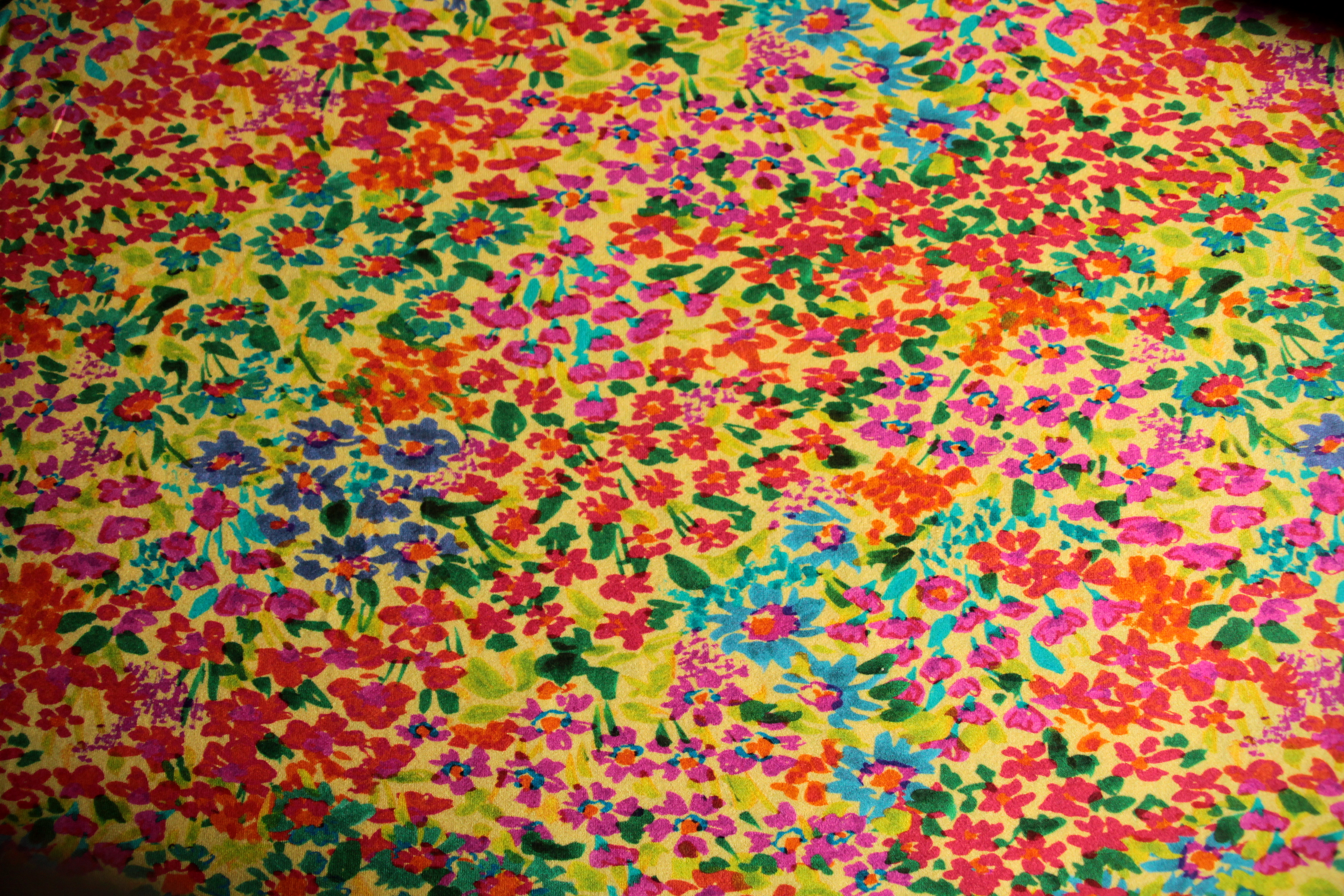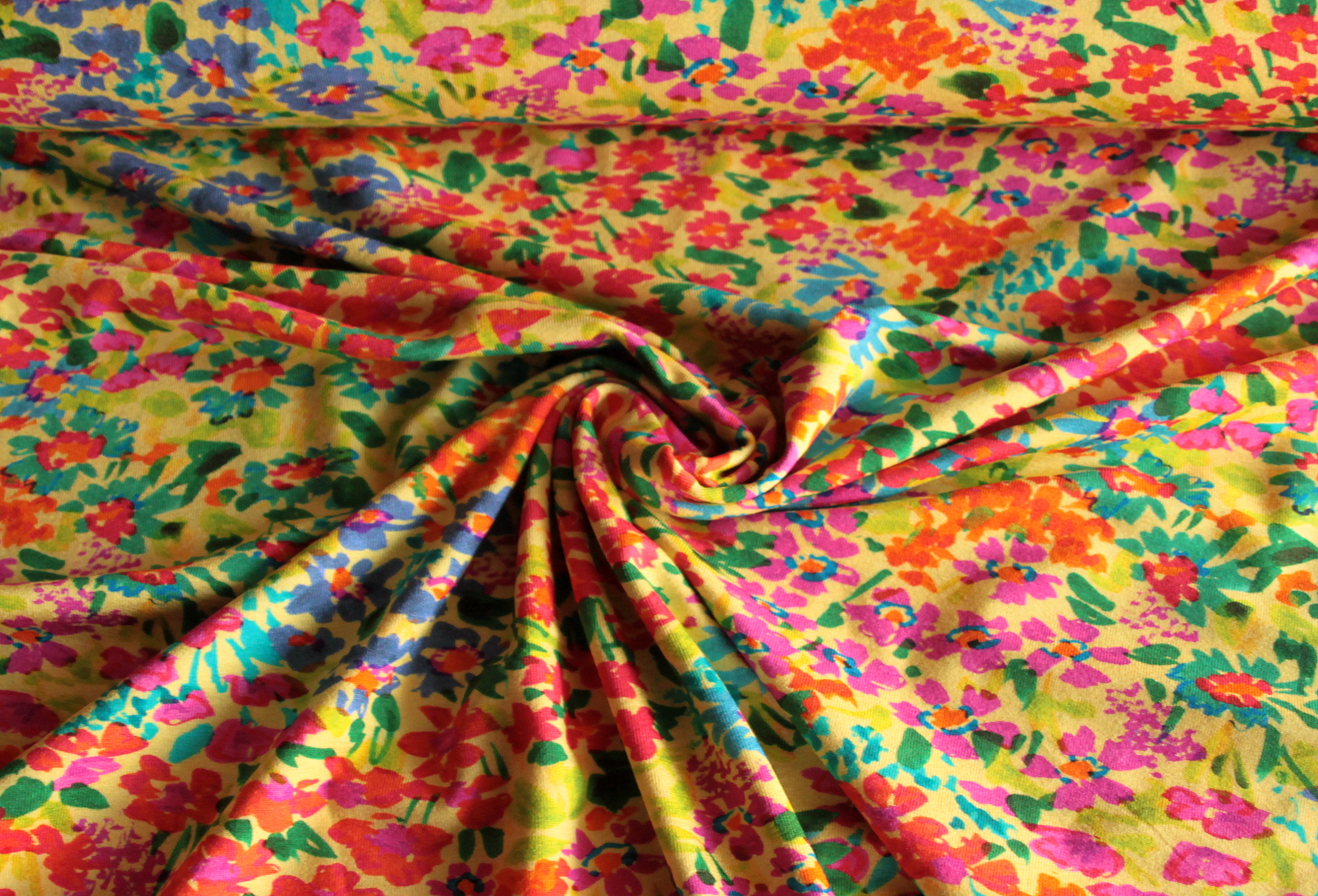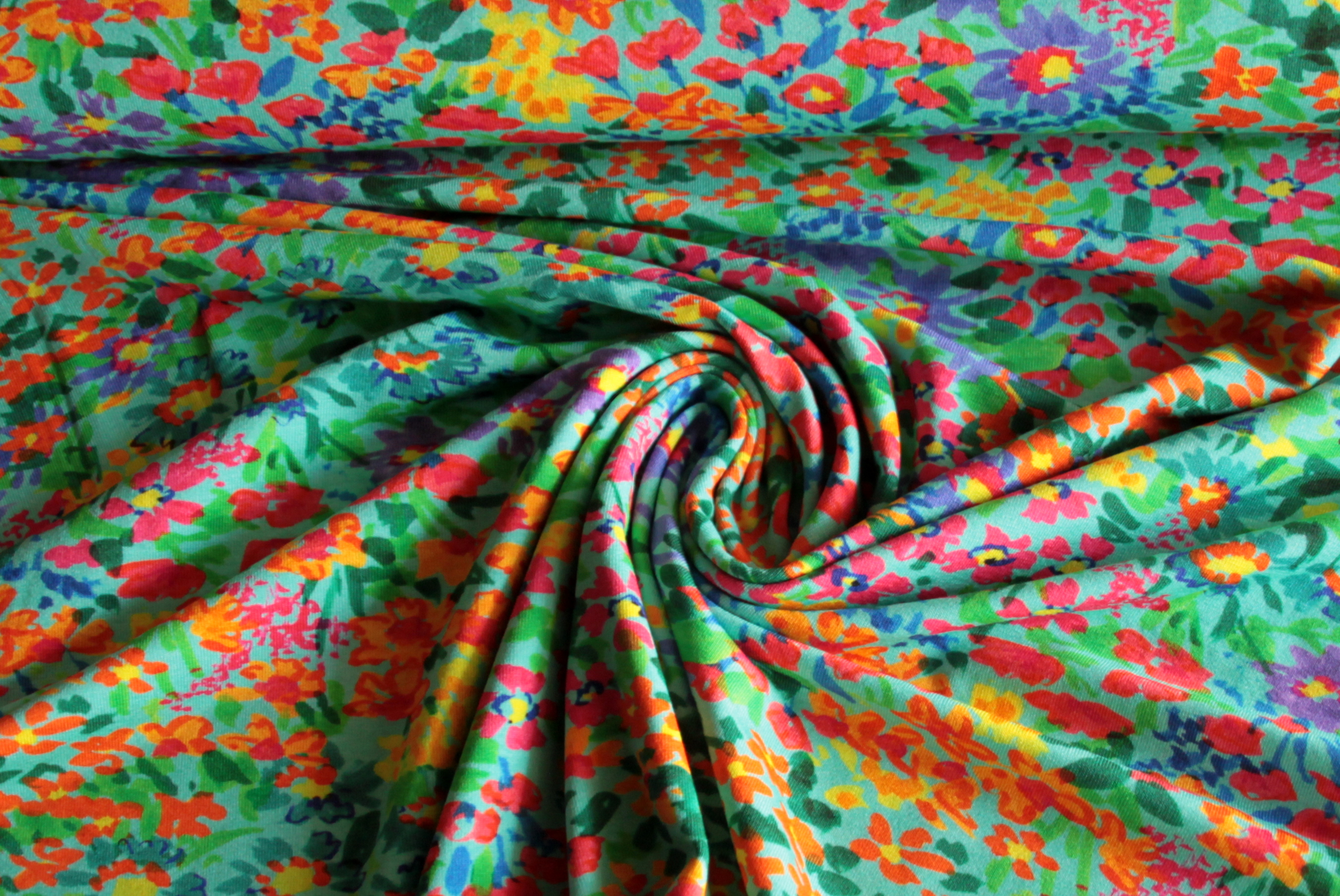 Modischer, weicher, fließender Jersey mit bunten Streublümchen auf gelbem oder mintfarbenem Grund. Der anschmiegsame, elastische Jersey mit glattem Griff hat einen schönen Fall. Der verspielte, farbstarke Blümchendruck wirkt fröhlich und sommerlich und eignet sich besonders für Sommerkleidung für Damen und Kinder wie T-Shirts, Tops, Tuniken, Kleider, Röcke,Hosen und Leggings.