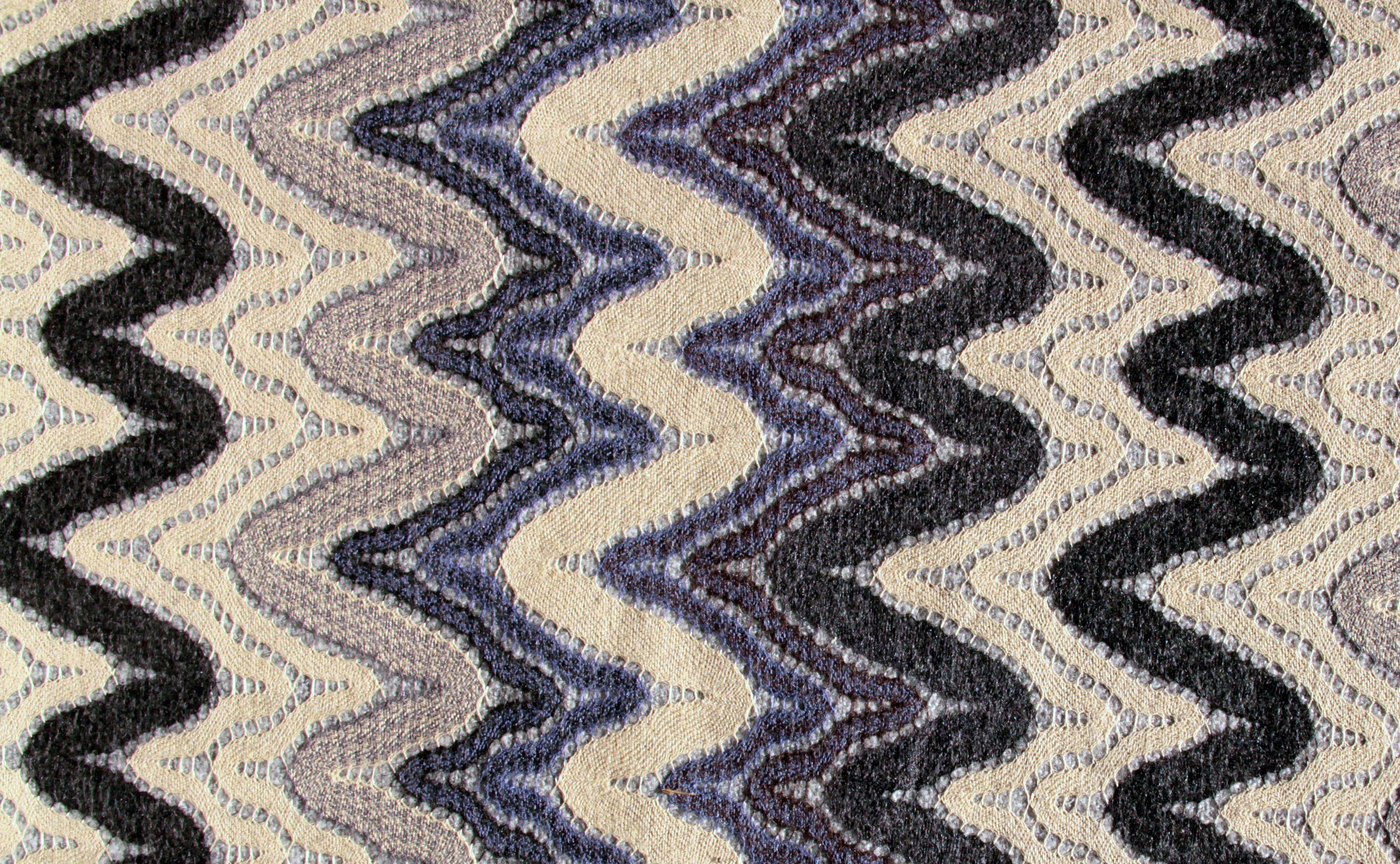 Weicher, anschmiegsamer und griffiger Jacquard Strickstoff mit apartem Zackenmuster in blau-beige-grau. Er eignet sich besonders für Pullover, Jacken, Westen, Röcke, Kostüme und Kleider sowie für Tücher und Capes. Auch im Dekobereich für Kissenbezüge, Plaids ist er ein Hingucker. Der Musterrapport beträgt ca. 36 cm, die "Zacken" sind ca. 7 cm hoch.
