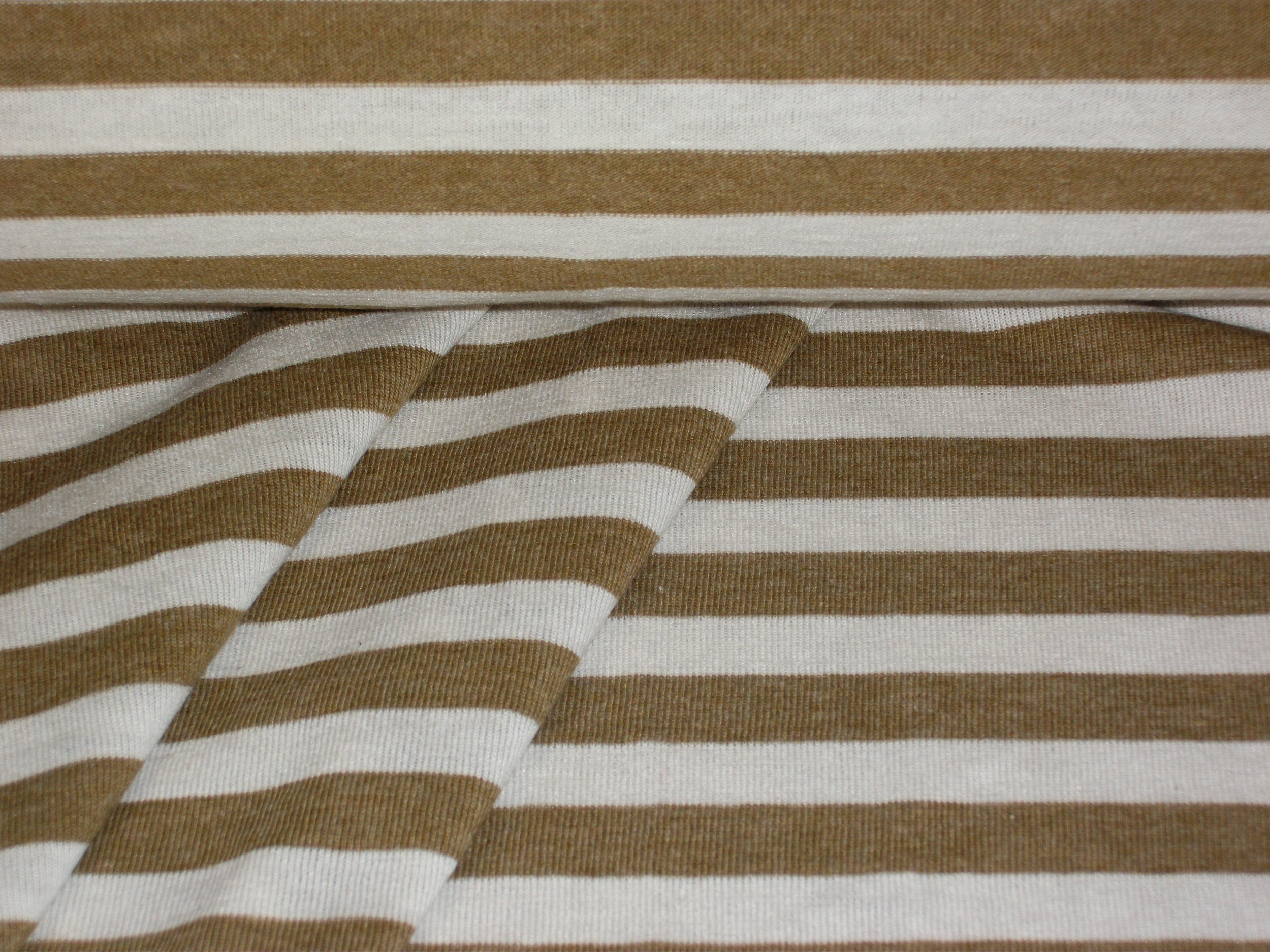 Leichter, elastischer Jersey mit Blockstreifen ca. 1 cm in camel-ecru geeignet für Shirts, Tops und Tuniken 65% Baumwolle, 32% Polyester, 3% Elastan Breite ca. 139 cm Gewicht ca. 283 g/lfm (Farbabweichungen zwischen Foto und Stoff sind möglich.)